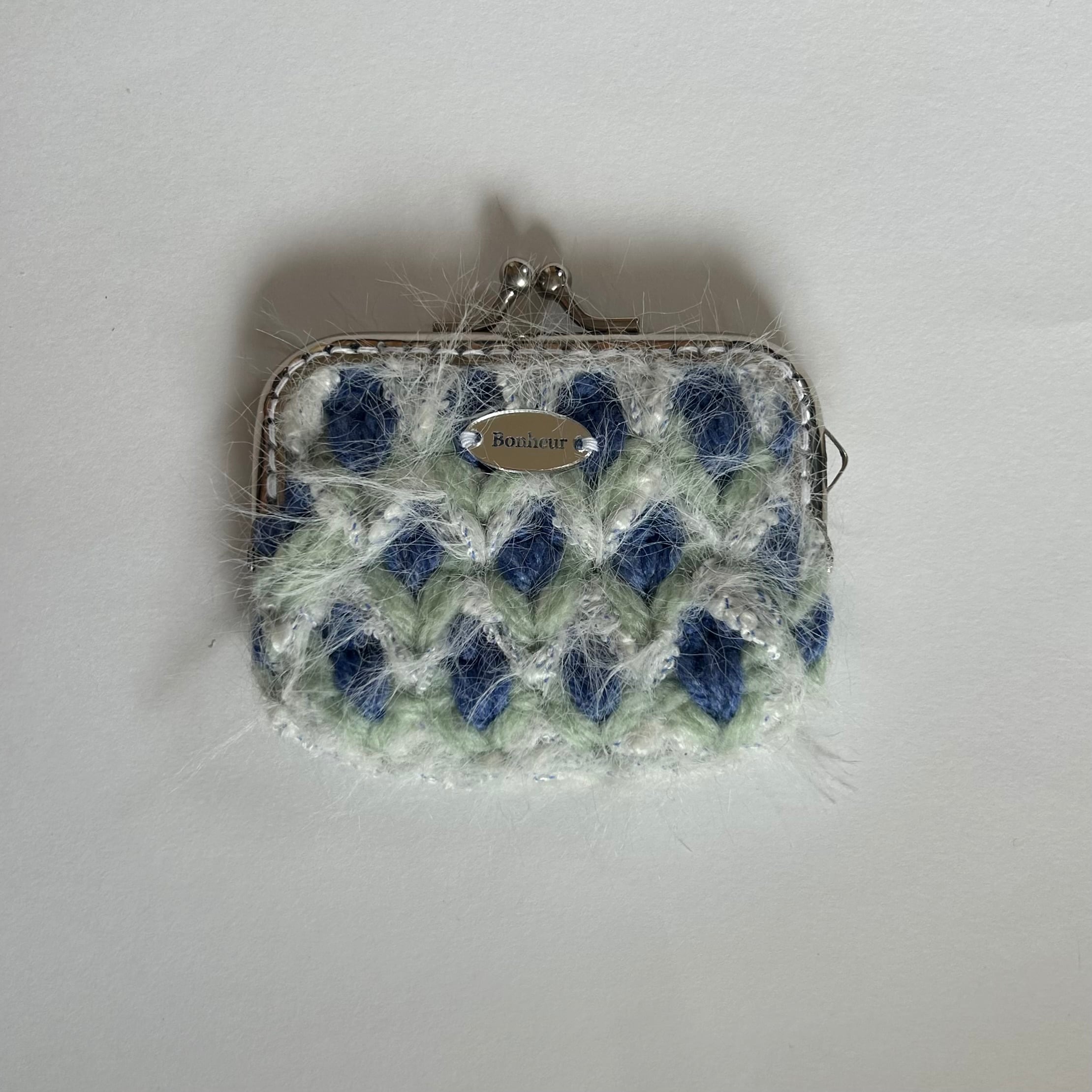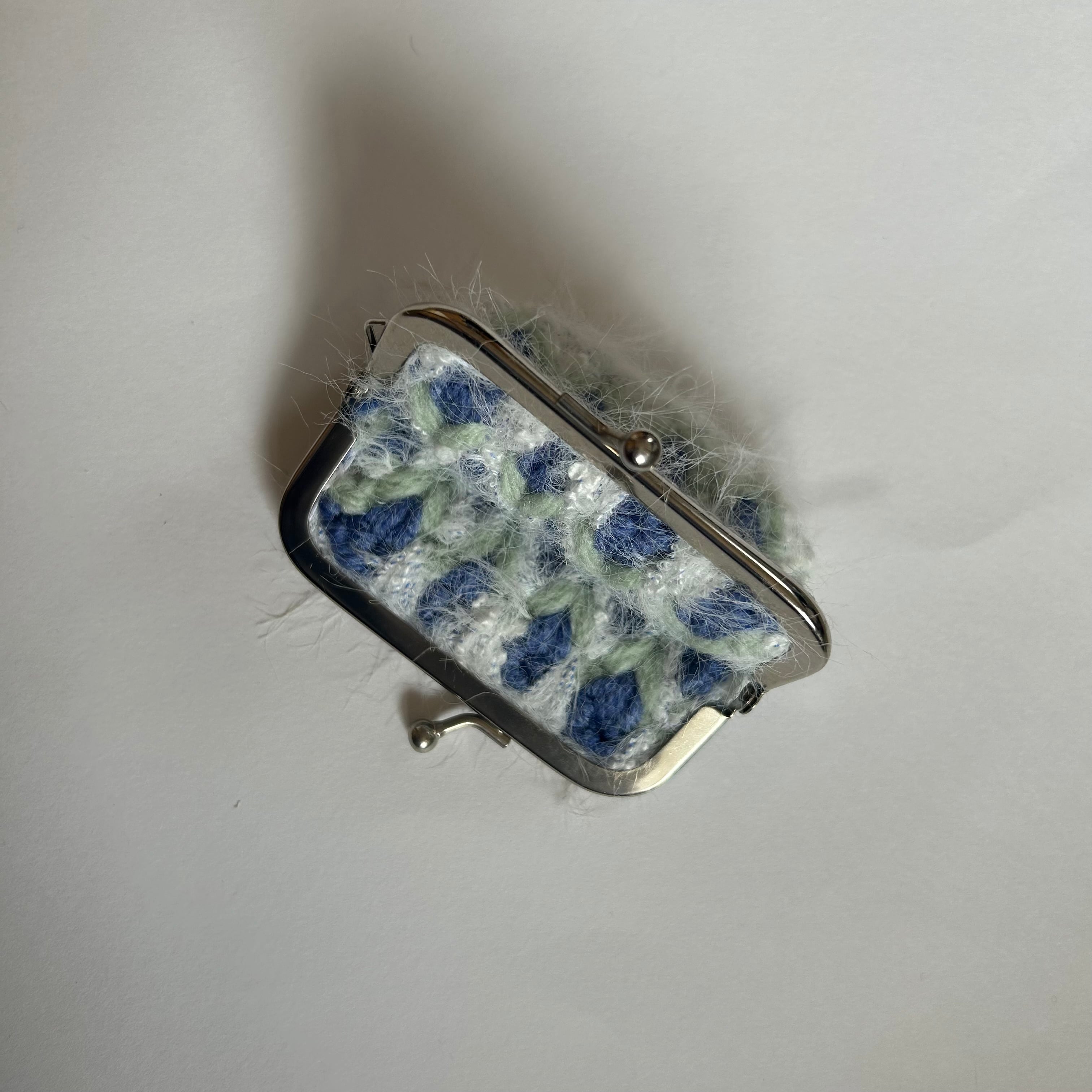 可愛らしい花柄が魅力的な手編みのコインケースです。印鑑やお薬入れにもちょうどいいサイズです。